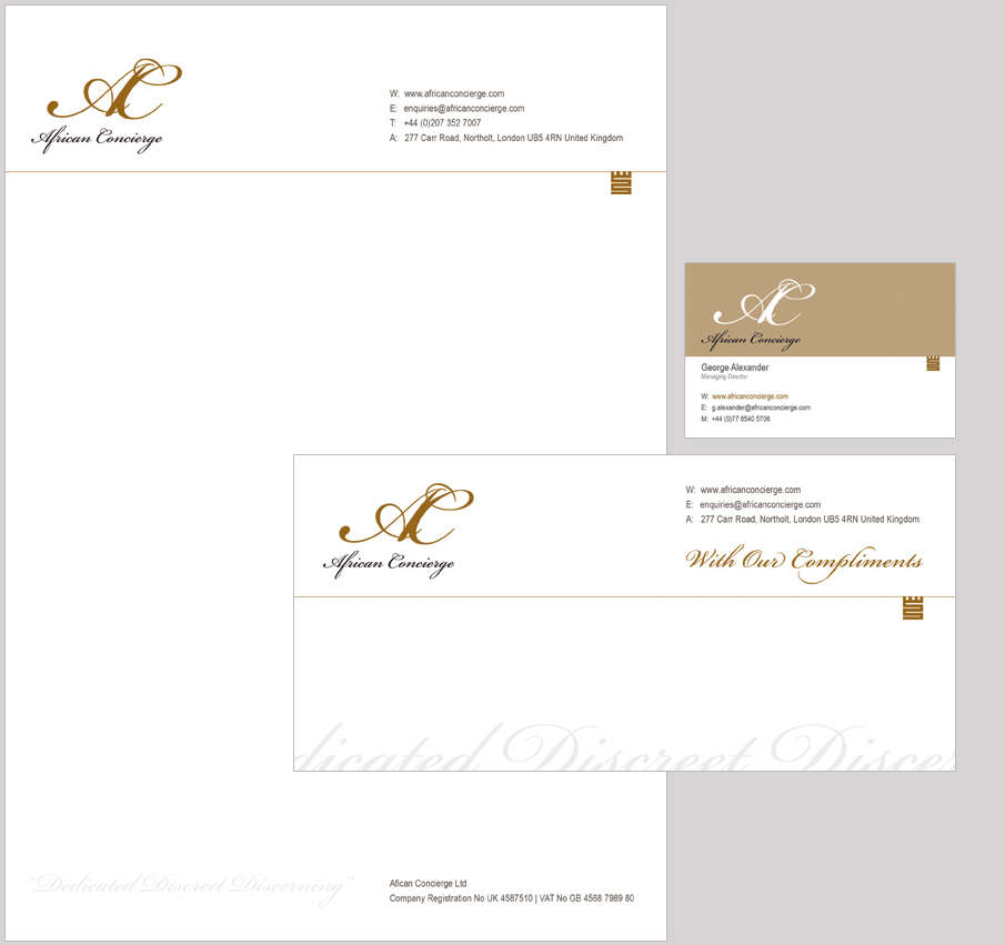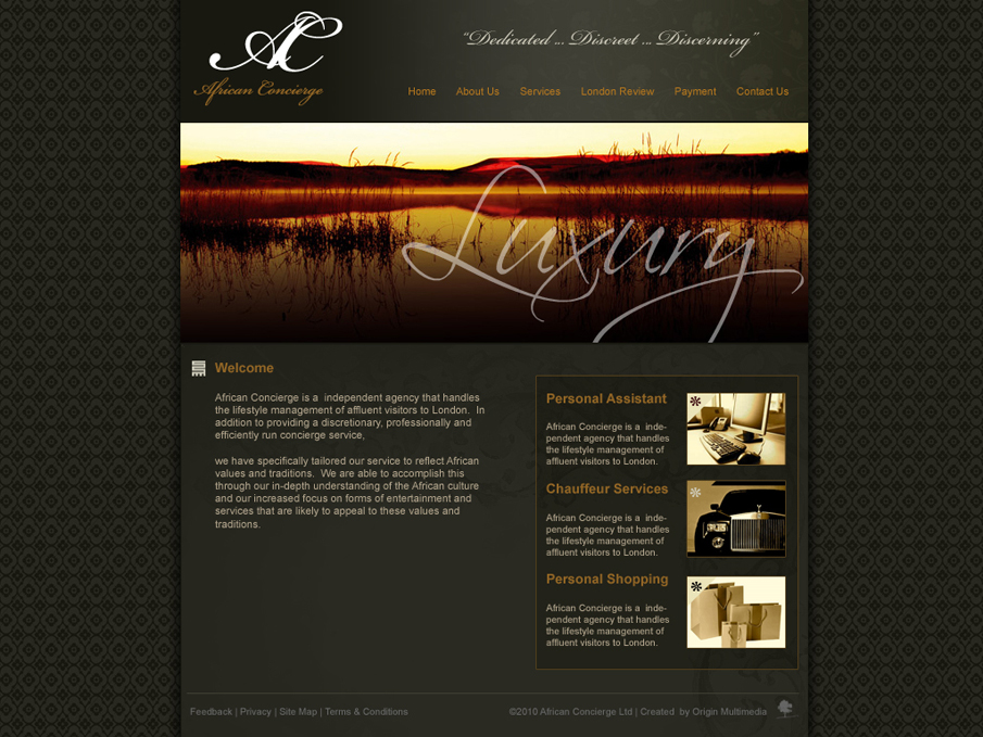 African Concierge is a newly formed, independent agency that handles the lifestyle management of affluent visitors to London. Luxury, prestige and exclusivity were what this brand was focusing on. The identity had to reflect this through out their website and print materials. (2010: Origin Multimedia Design, Identity & Website design)