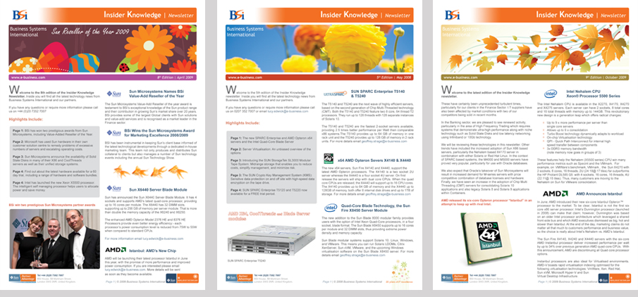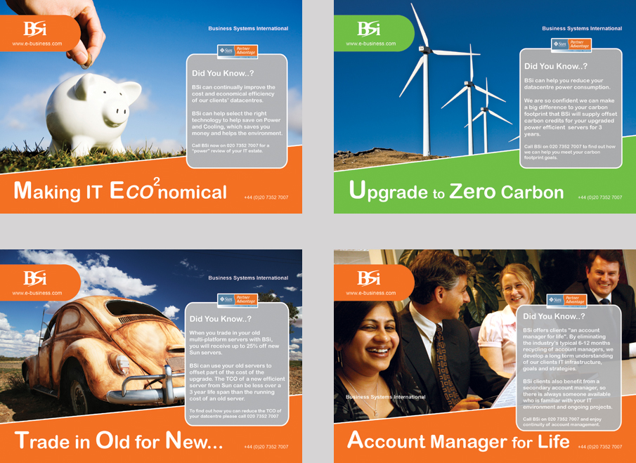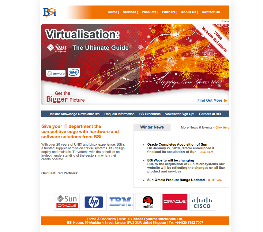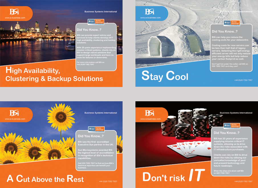 I was with Business Systems International for just over four fruitful years. I was employed as a Web/Graphic designer when I graduated from Brunel University working under the Marketing Director. Within three years, I was put in charge of the company’s design team, planning and executing campaigns working along side the marketing team. I have put a cross selection of the different types of work I created during my time at BSi. When I started working for BSi one of the things I was charged with was designing and creating the website, to showcase the company’s extensive range of product and services which I maintained for the duration of my tenure. (2006-10: Business Systems International, Print, Web & Branding)