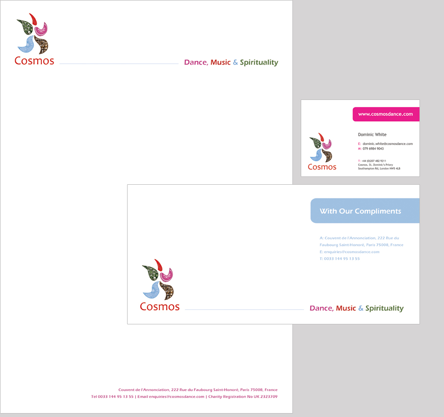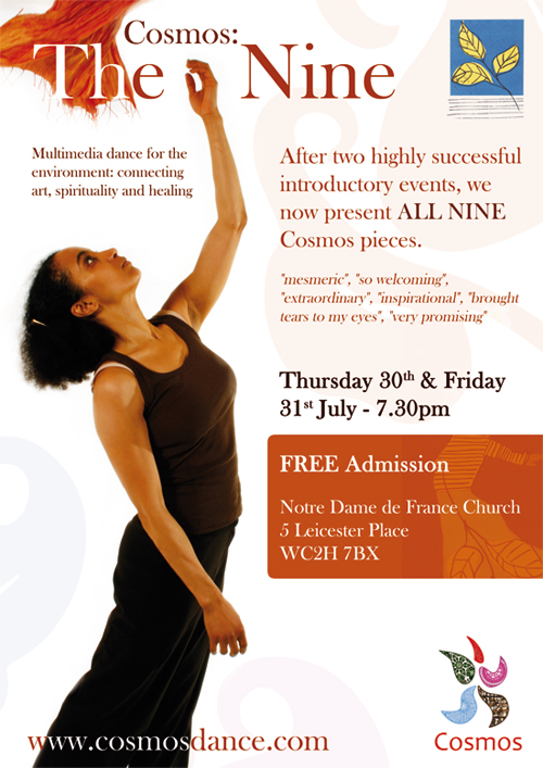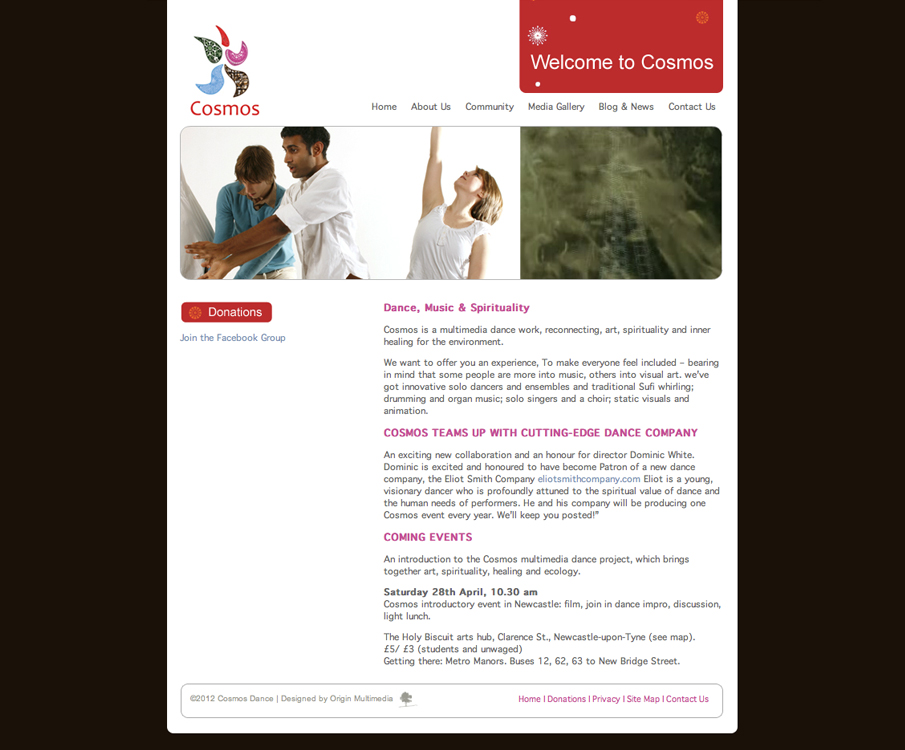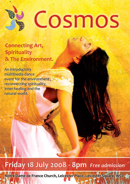 Cosmos is a multimedia dance collective that is reconnecting art, spirituality and inner healing for the environment. Offering an experience, to make everyone feel included – bearing in mind that some people are more into music, others into visual art. Cosmos has got innovative solo dancers, ensembles and traditional Sufi whirling, solo singers, a choir with static visuals and animation. (2008: Origin Multimedia Design, Print, Web, Photography & Identity)
