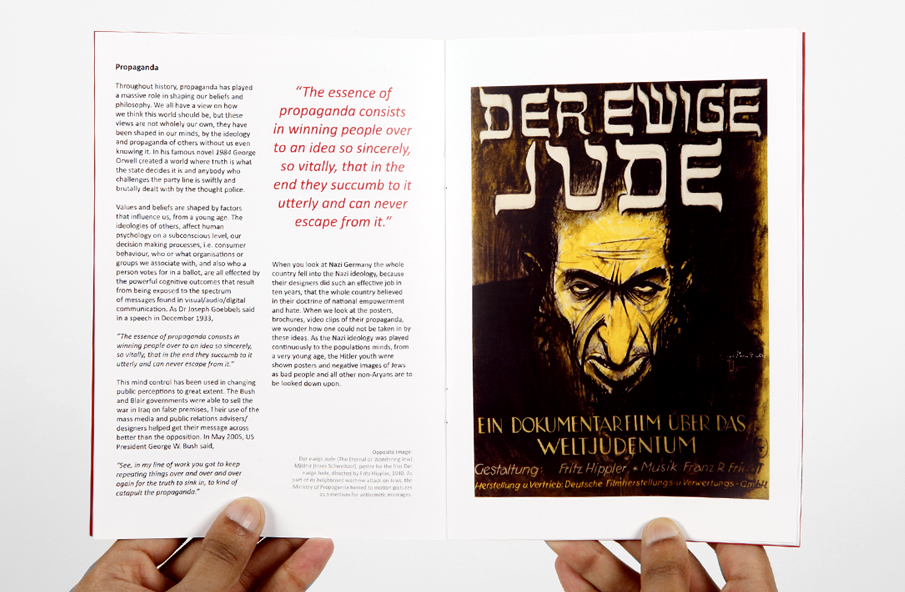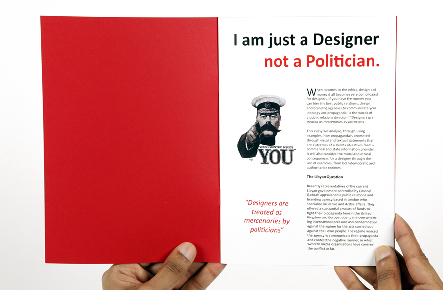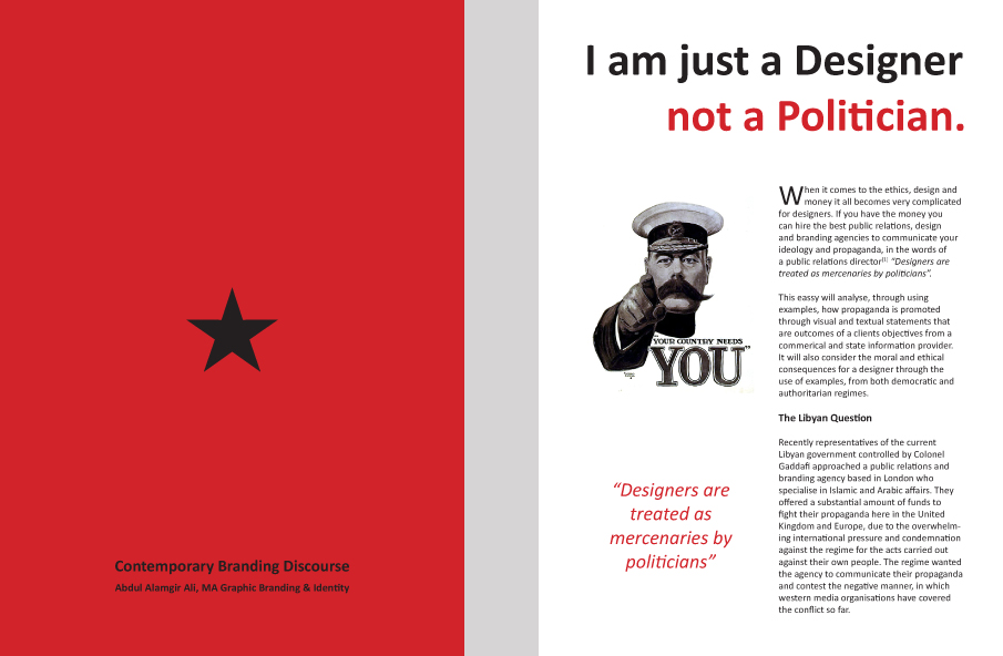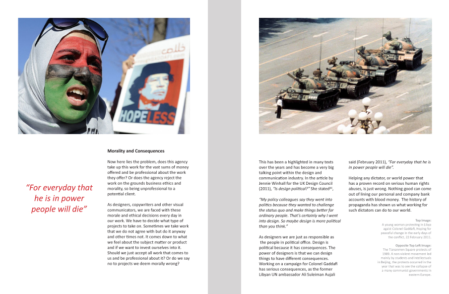 As part of my project work at London College of Communication, I wrote a Contemporary Design Discourse that has shaped design theory, practice and culture. I was greatly influenced by the Manifesto: First Things First 2000; that designers should use their talent for something more worthy of their problem-solving skills. Unprecedented environmental, social, and cultural crises demand their attention rather than just making money for commercial, corporate companies. (2011: London College of Communication, Print)