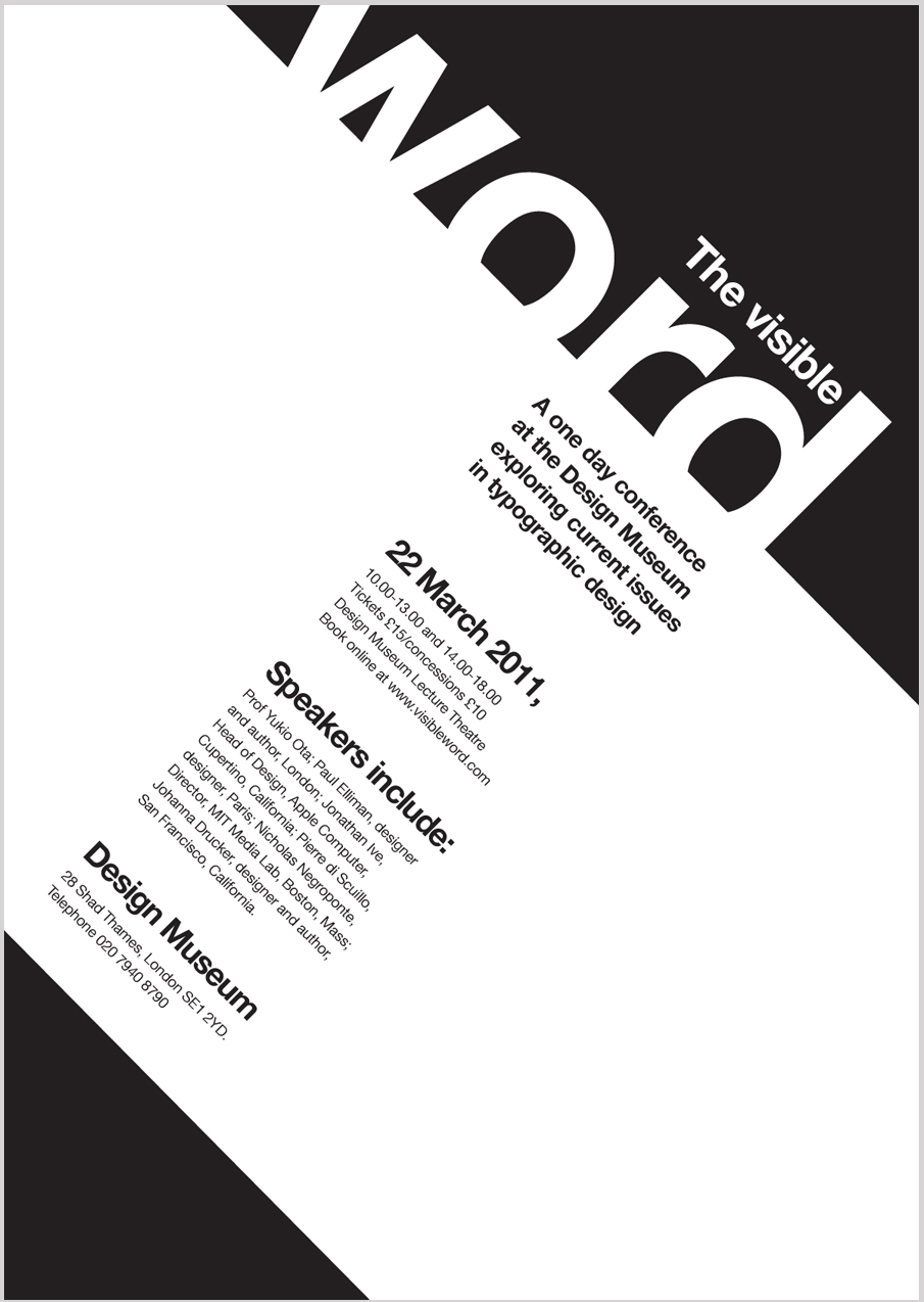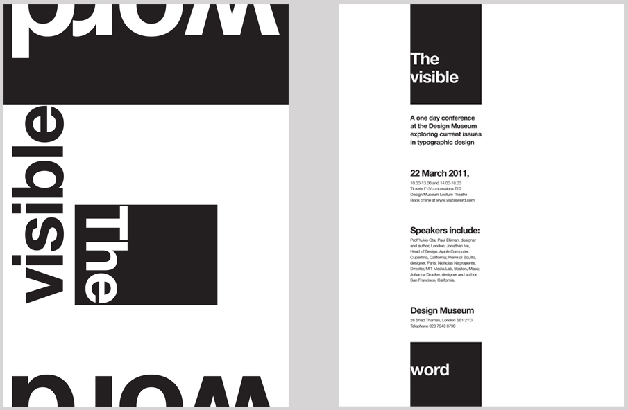 This was a project commissioned by London College of Communication, to design a postable poster for invited guests at a one day conference, at the Design Museum exploring current issues in typographic design called “The Visible Word”. (2011: London College of Communication, Print)