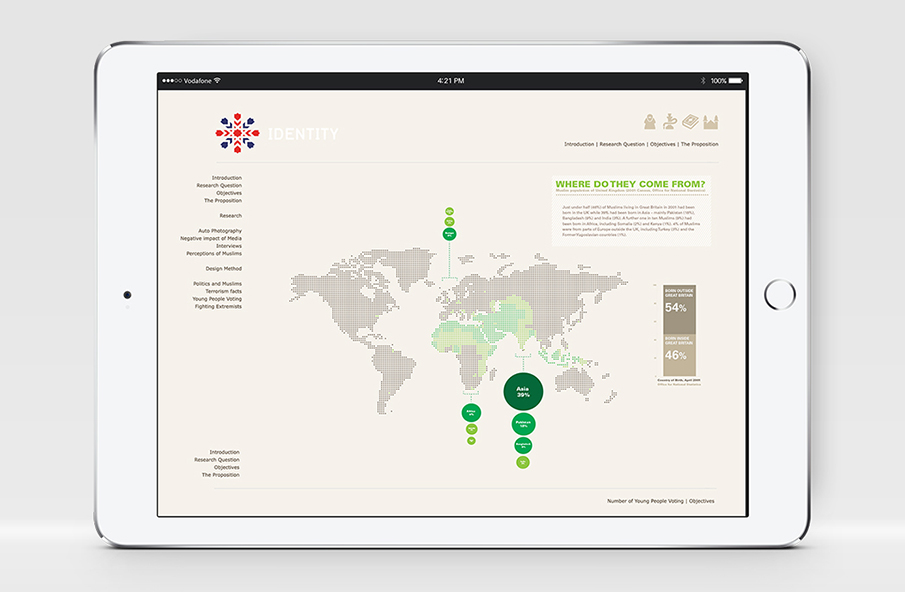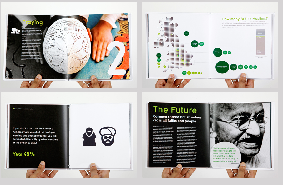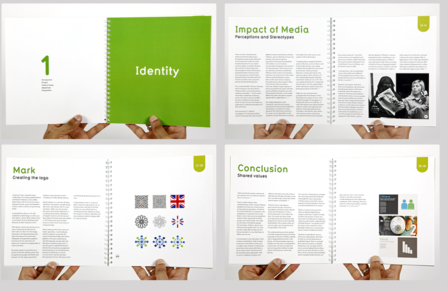 As a society we need to understand one another across cultural and faith boundaries. In our diverse communities around the country people live, study and work alongside one another, sometimes without fully understanding each other. This project aims to address a few of the negative perceptions and stereotypes surrounding young British Muslims. Through the Website and Publications (Documents Restricted, Please contact me to view), I aim to show how young people feel and think about Muslims in Great Britain. (2011: London College of Communication, Identity, Print & Web)