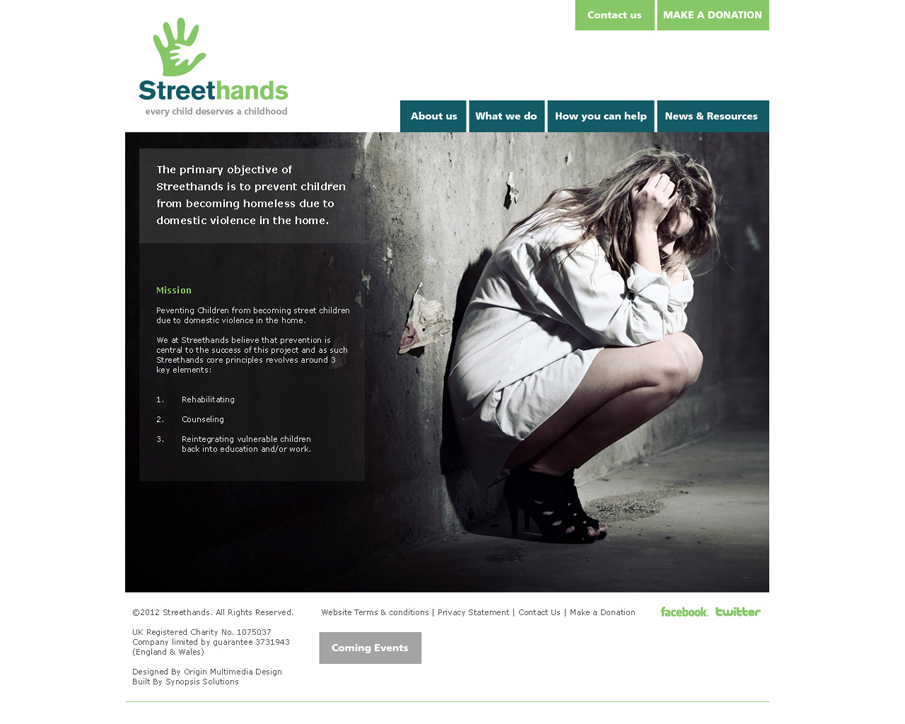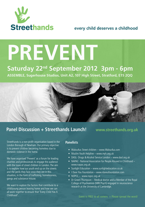 Streethands is a non-profit organisation based in the London Borough of Newham. Our primary objective is to prevent children becoming homeless due to domestic violence in the home. (2012: Origin Multimedia Design, Identity & Web)