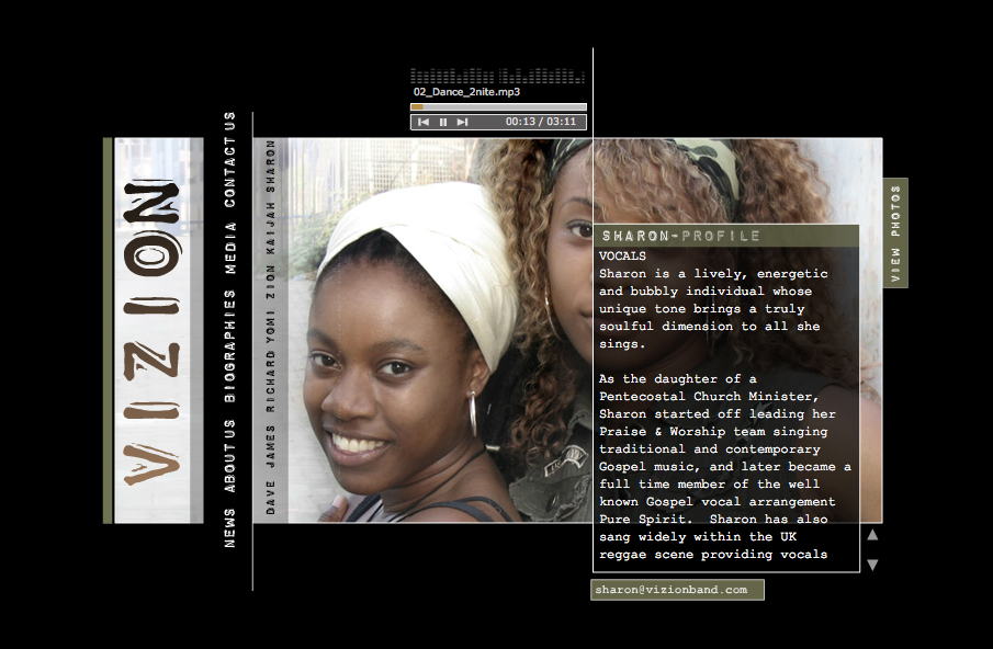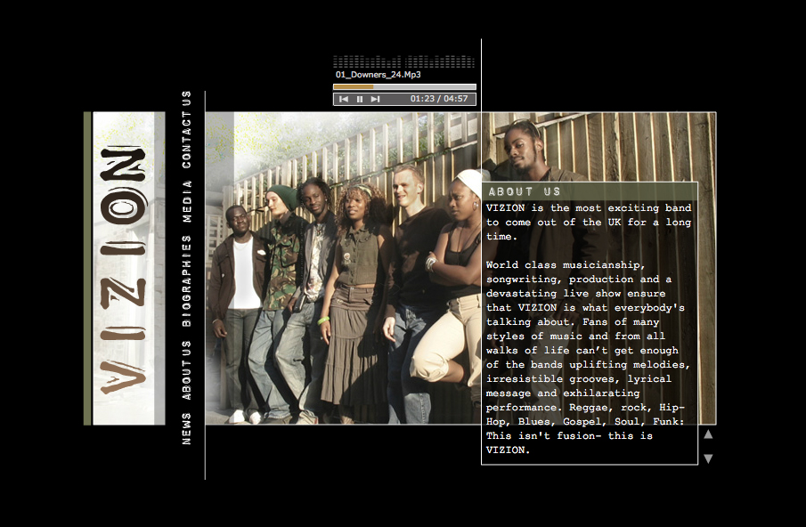 My BSc final year project is about promoting a music band called Vizion. They are a new young and exciting band that needs a whole spectrum of multimedia artefacts, which will help them, become a popular band. I have researched into the types of music genres that have influenced Vizion and how other bands it the past have been promoted, So that I may gain knowledge in how to go about promoting and branding Vizion. View Flash Website and Photo Gallery (2006: Brunel Univeristy, Identity, Photography & Web)
